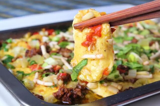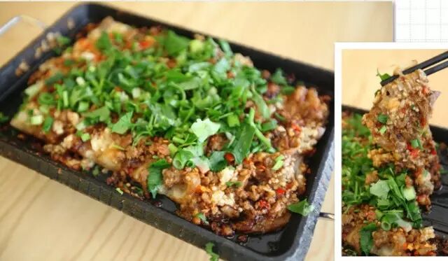 整整一个大茄子平铺在烤盘上,伴有肉糜和小米辣,最上面还满满地撒了香菜和香葱,让人看到就食指大动。整道菜的味道很讨喜,茄子外皮香脆、口感绵软,辣中似乎又透着些甜味。