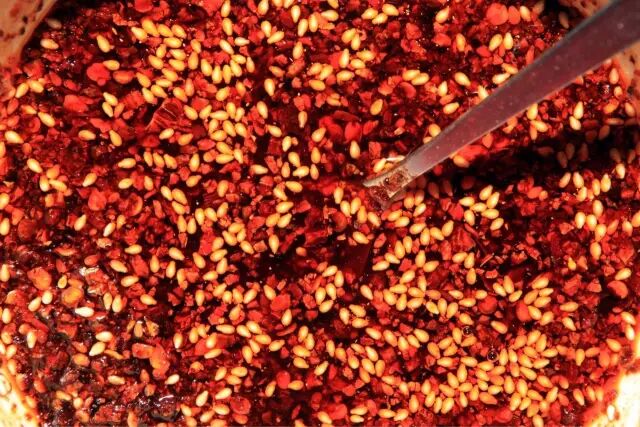 调料全是出自陕西,为了做到和【家乡味道】无限接近。特别是辣椒,在磨成粉之前,还有过简单的炒制,辣椒的香味就被激发出来了!