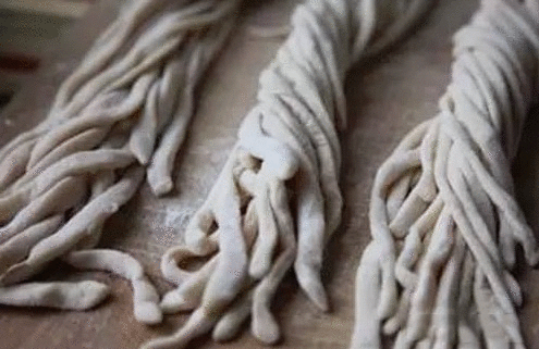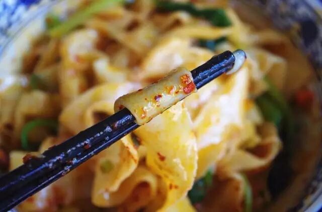 吃的时候从盆里夹出宽厚且长的面条拉到碗里的汤中,
